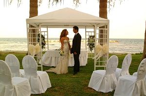 The Palm Beach Hotel, located on the eastern coast of Cyprus, just to the north of the town of Larnaca; offers a number of perfect wedding locations in its grounds, whether it's a beach gazebo wedding, a ceremony in the gardens or to exchange your vows in the hotel's pretty chapel, anything is possible. Weddings at the Palm Beach Hotel are conducted by the services of the local registrar and the attentive service that the hotel provides will ensure that the lead up to your wedding day is stressfree and the day itself runs smoothly.